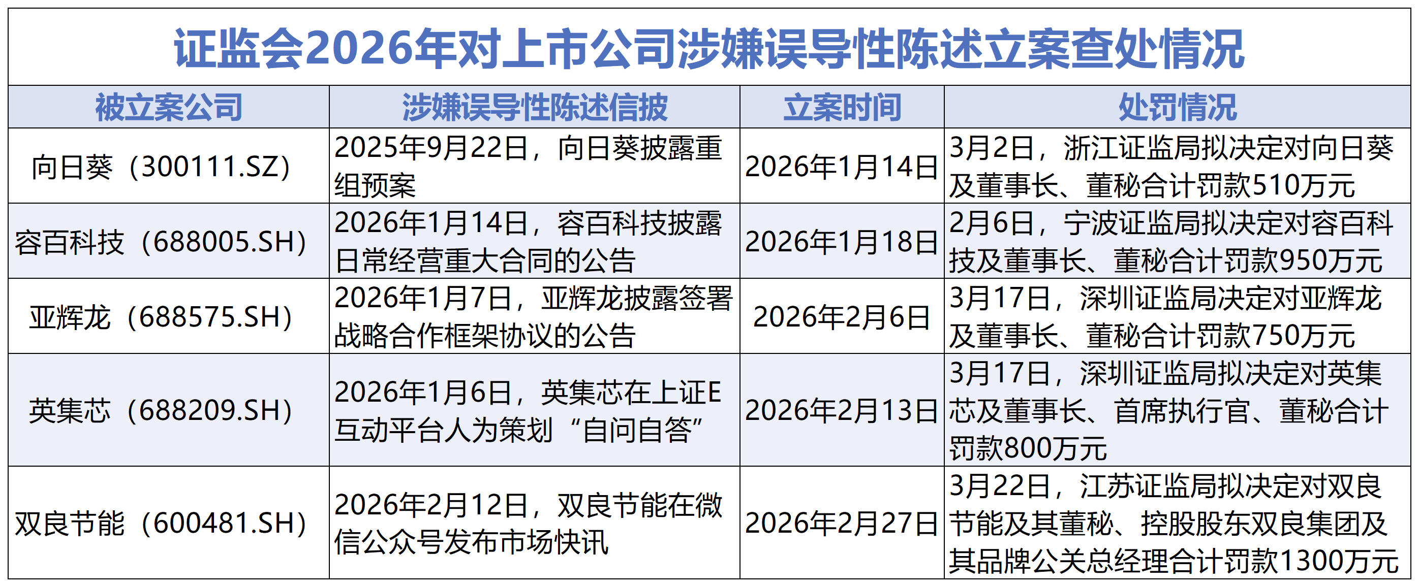 而随着双良节能案拟处罚决定的公布,证监部门对2026年一季度立案的5起涉嫌误导性陈述案件,都已作出行政处罚决定或事先告知。