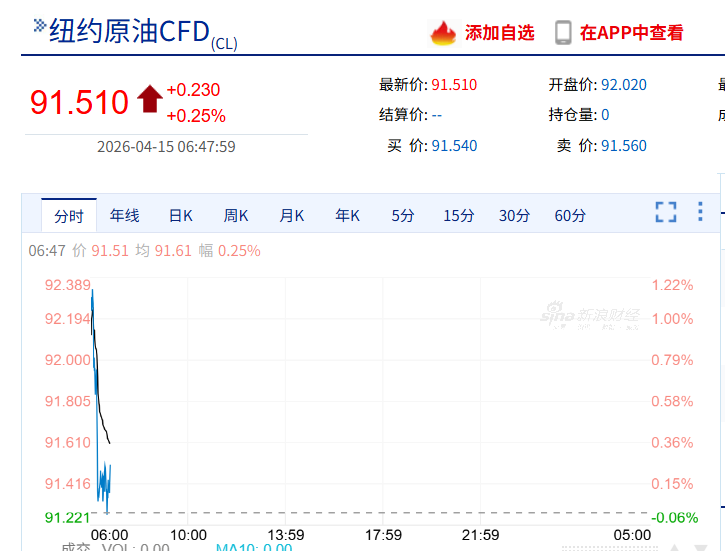国际原油期货收盘重挫,WTI原油期货收跌7.87%,布伦特原油期货收跌4.6%。4月15日早盘,WTI原油期货开盘涨1%,截至发稿涨幅有所回落。